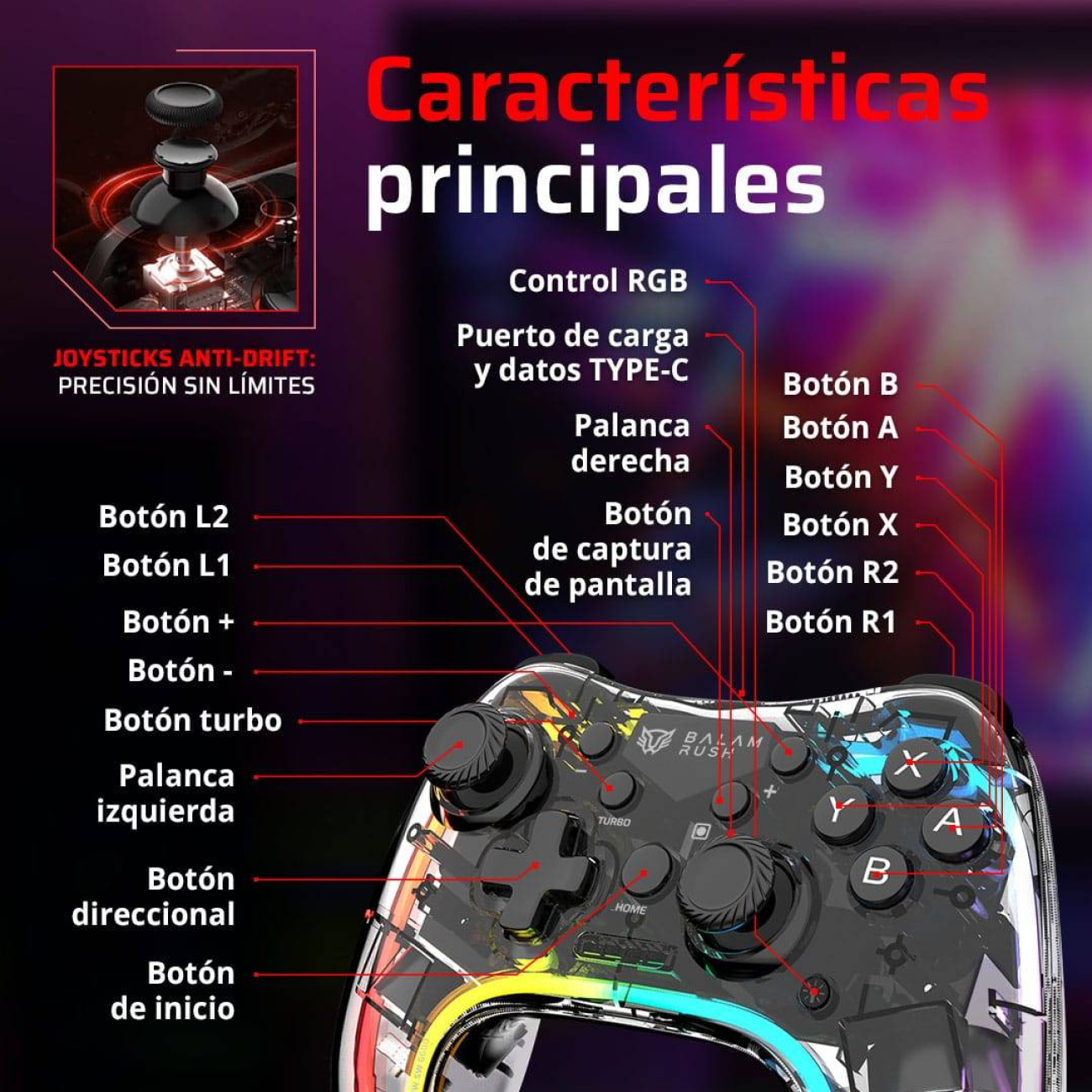 - Gamepad Inalámbrico Kontrol Glow SWG600 BALAMRUSH AZENDER SERIES Conectividad: Inalámbrica, Bluetooth 5.0, Rango de Trabajo 8 Metros, Compatibilidad: Nintendo Switch / Lite / OLED/ Android / IOS/ PC, Vibración Inmersiva Dual, Iluminación RGB, Batería 800mA, Tiempo de carga 3h, Duración de batería 5-8h, Puerto de Carga Tipo C, Color Trasparente. BR-940467